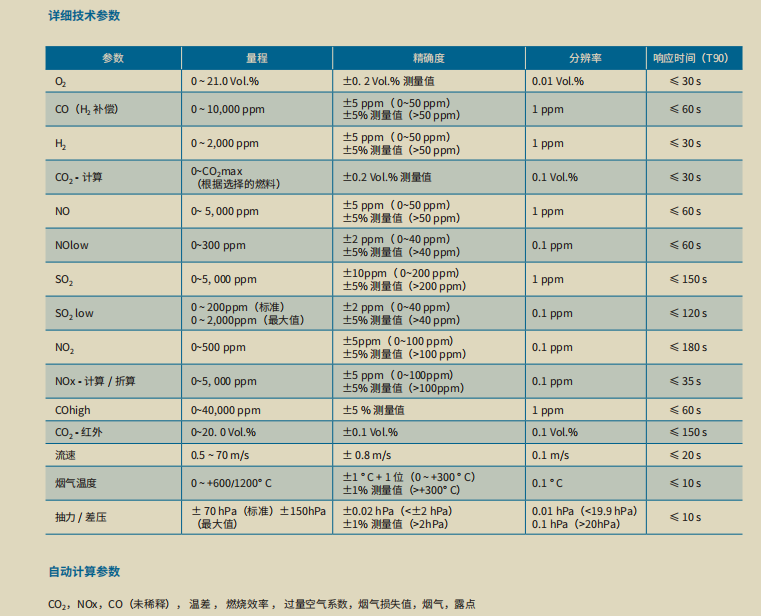 測量參數(shù): ? O2 ? COhigh ? COH2(H -補(bǔ)償) ? CO2 (紅外) ? NO ? NO2 ? SO2 ? 差壓/抽力 ? Tair(環(huán)境溫度) ? Tgas(煙氣溫度) ? ΔTgas(溫差測量) ? 大氣壓 | 計(jì)算參數(shù): ? 流速 ? CO2 ? CO(未稀釋) ? 溫差 ? 燃燒效率 ? λ(過量空氣系數(shù)) ? 煙氣損失值 ? COref(與O2 配置) ? Tau(露點(diǎn)) ? NOx(NO+NO2 ) ? NOref ? SO2 ref |